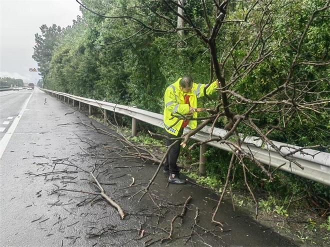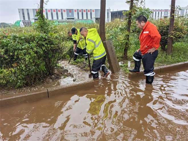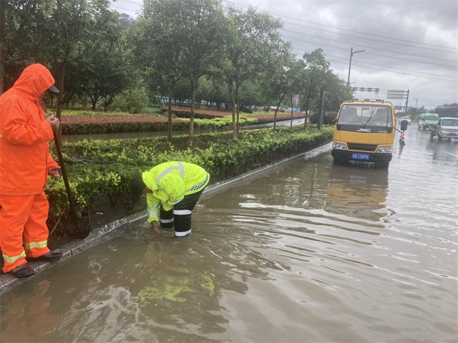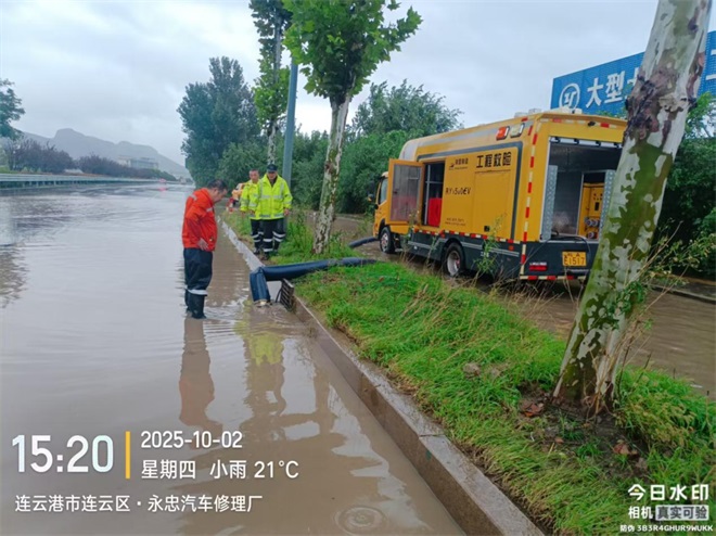 10月2日,大雨突降,公司迅速啟動(dòng)防汛應(yīng)急預(yù)案,嚴(yán)格落實(shí)防汛措施,不分晝夜,連續(xù)對(duì)所轄高速公路、國(guó)省干線等重點(diǎn)路段及沿線設(shè)施開展隱患排查,確保道路安全暢通。針對(duì)G310港城大道、G228新光路等路段積水較多、路邊樹木倒伏等嚴(yán)重情況,公司立即組織橙色突擊隊(duì)員、道路養(yǎng)護(hù)人員及時(shí)清理疏通倒伏樹木、排水溝、雨水井,全力保障排水系統(tǒng)暢通與道路安全,累計(jì)出動(dòng)道路養(yǎng)護(hù)人員 90人次、巡查車輛 12臺(tái)次,調(diào)配各類機(jī)械設(shè)備 14 臺(tái)次,清理倒伏樹木20余株。連云港綜合客運(yùn)樞紐出站口突發(fā)雨水倒灌,公司立即組織應(yīng)急人員協(xié)助連云港站前廣場(chǎng)管理服務(wù)聯(lián)盟調(diào)動(dòng)水泵排水并引導(dǎo)旅客安全出行。經(jīng)50分鐘緊急處置,積水全部排除,道路恢復(fù)暢通。
