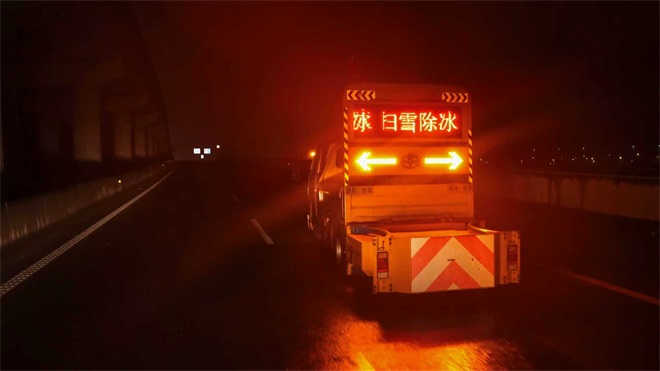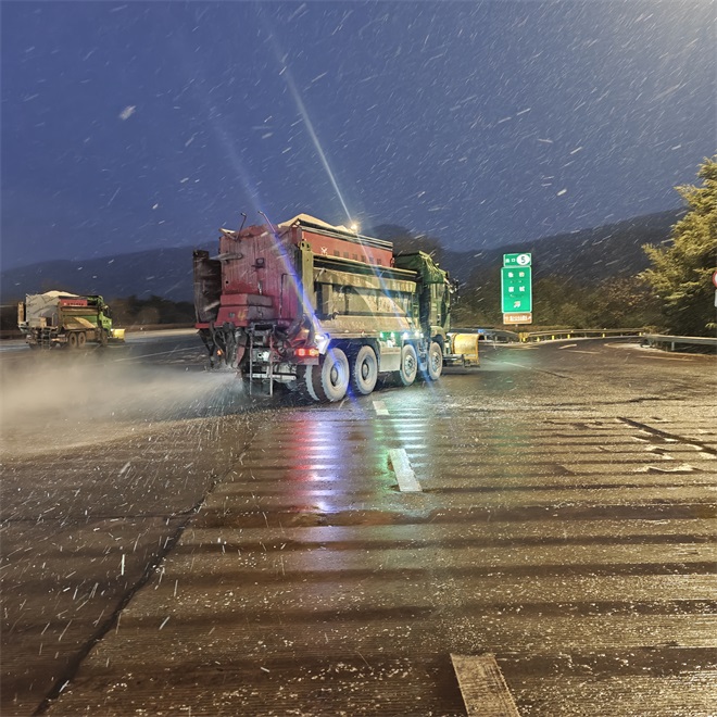 針對此次降雪可能引發(fā)的道路積雪、結冰隱患,豐達公司堅持“預”字為先、“防”字為要,集結“橙色突擊隊”,開展全天候動態(tài)巡查,確保以“快、準、實”的舉措把安全隱患消除在萌芽狀態(tài)。降雪伊始,公司領導率先垂范,帶領全體人員奮戰(zhàn)一線,各工區(qū)點位人員全員在崗在位。寒風裹挾著雪花肆虐,夜色籠罩下的道路逐漸覆冰,“橙衣戰(zhàn)士”毫無退縮,他們頂風冒雪奔赴一線,掃雪車開道清障,撒布機均勻拋灑融雪劑,人工組跟進清理路邊殘雪。燈火映照下,“橙衣戰(zhàn)士”與機械并肩作戰(zhàn),勾勒出寒夜中最動人的“破冰”畫卷。